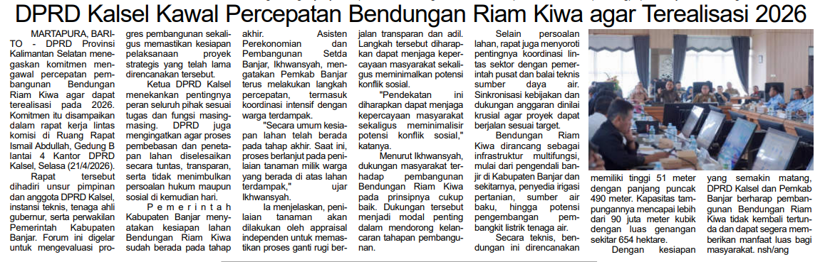 DPRD KALSEL KAWAL PERCEPATAN BENDUNGAN RIAM KIWA AGAR TERIALISASI 2026