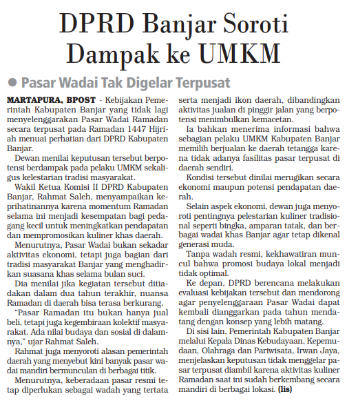 DPRD BANJAR SOROTI DAMPAK KE UMKM - PASAR WADAI TAK DIGELAR TERPUSAT