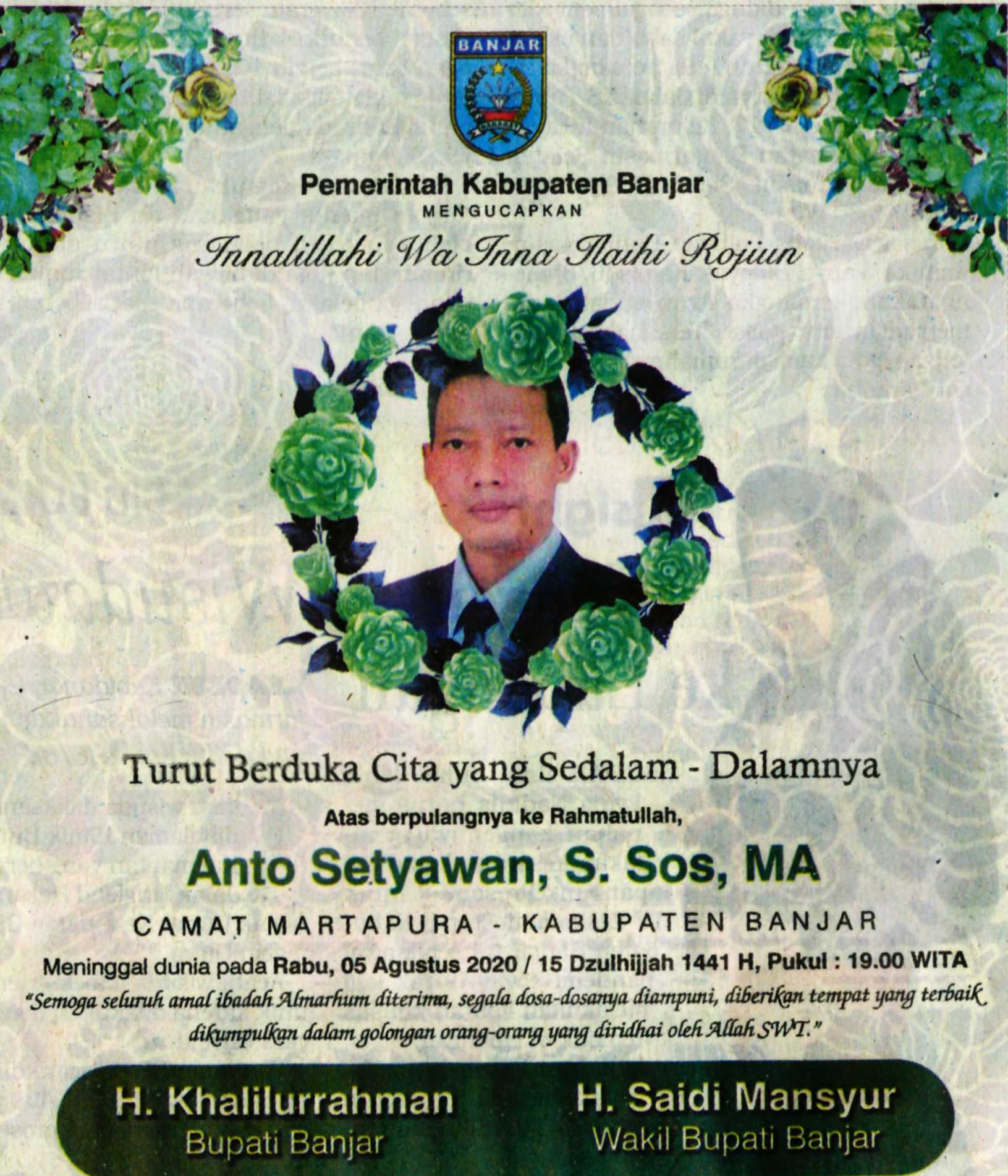 PEMKAB BANJAR MENGUCAPKAN TURUT BERDUKA CITA YANG SEDALAM-DALAMNYA ATAS BERPULANGNYA KE RAHMATULLAH